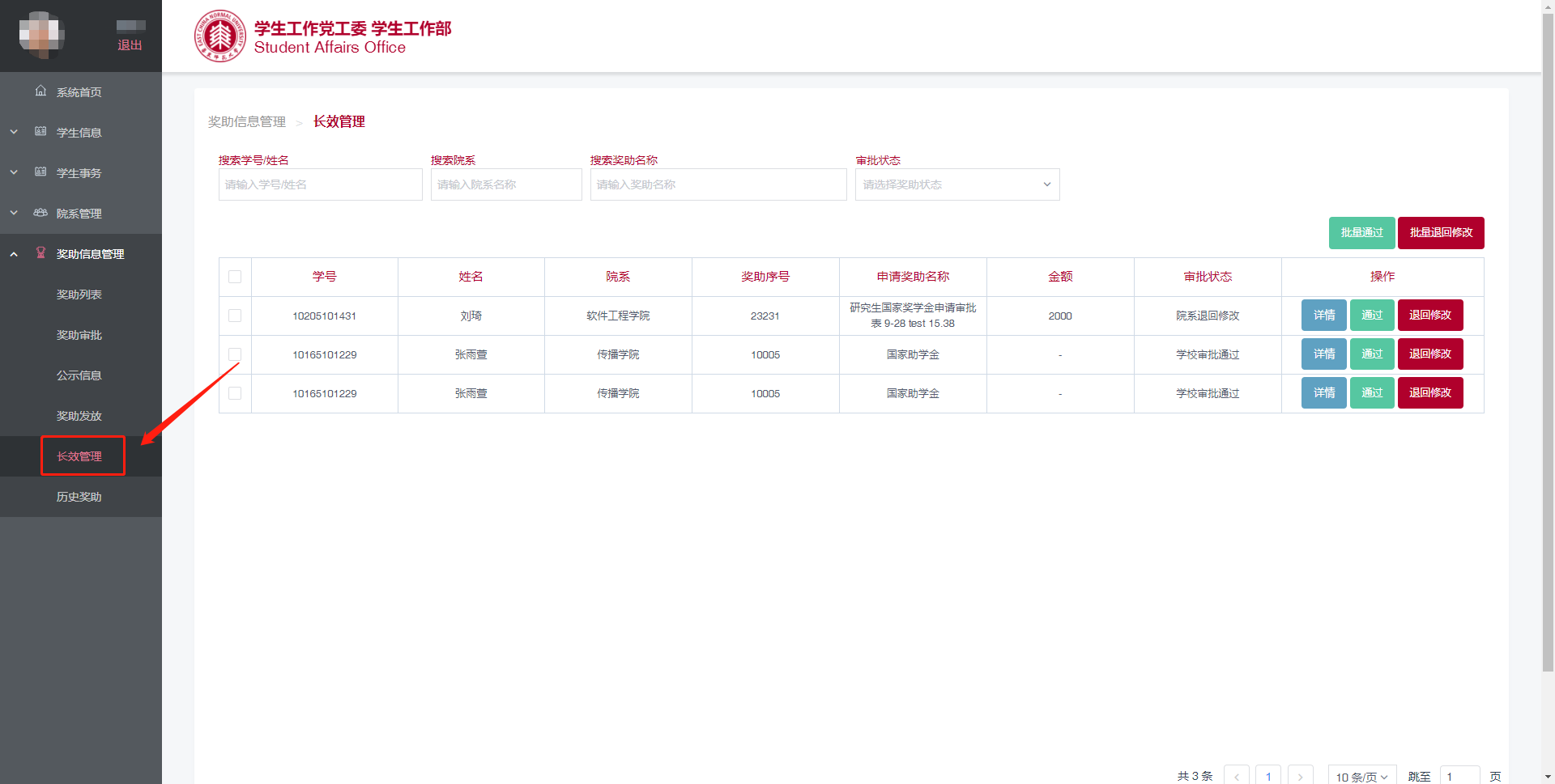在左侧“奖助信息管理”一栏中,点击“长效管理”进入页面,查看所有学生的长效管理申请(图6.1)。