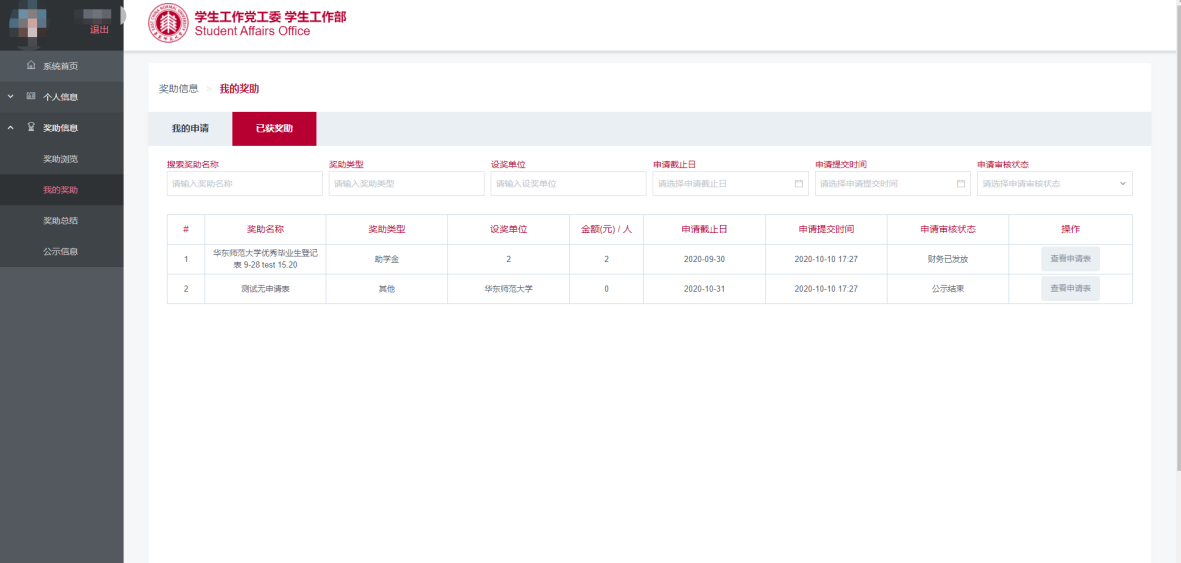 在“已获奖助”标签页中里面可以看到已完成审批流程的奖助学金。(图3.2)