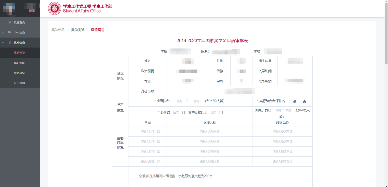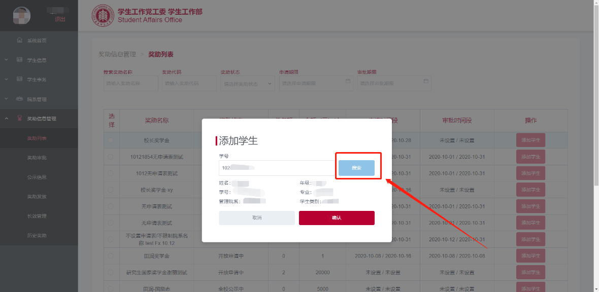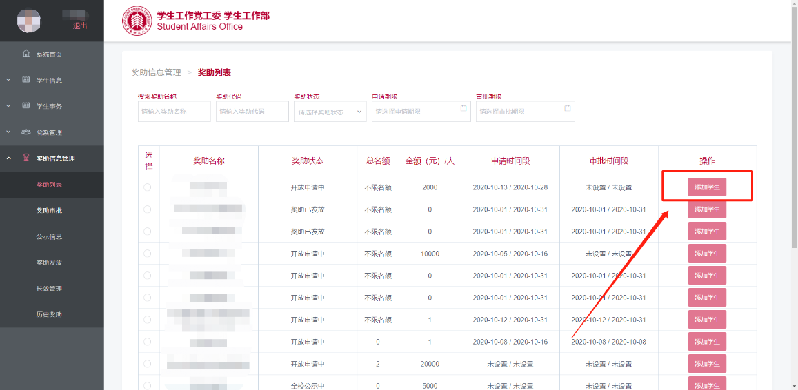 系统允许院系管理员手动为学生申请奖助,具体操作如下: