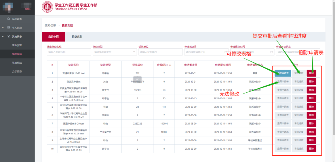 “我的申请”标签页中显示的是申请书草稿与正在等待审批的奖助学金。草稿条目可以点击其右侧对应的“修改申请表”继续编辑申请书;已提交的申请不可修改,可以点击其右侧的“查看申请表”查看或者打印申请表。(图3.1)