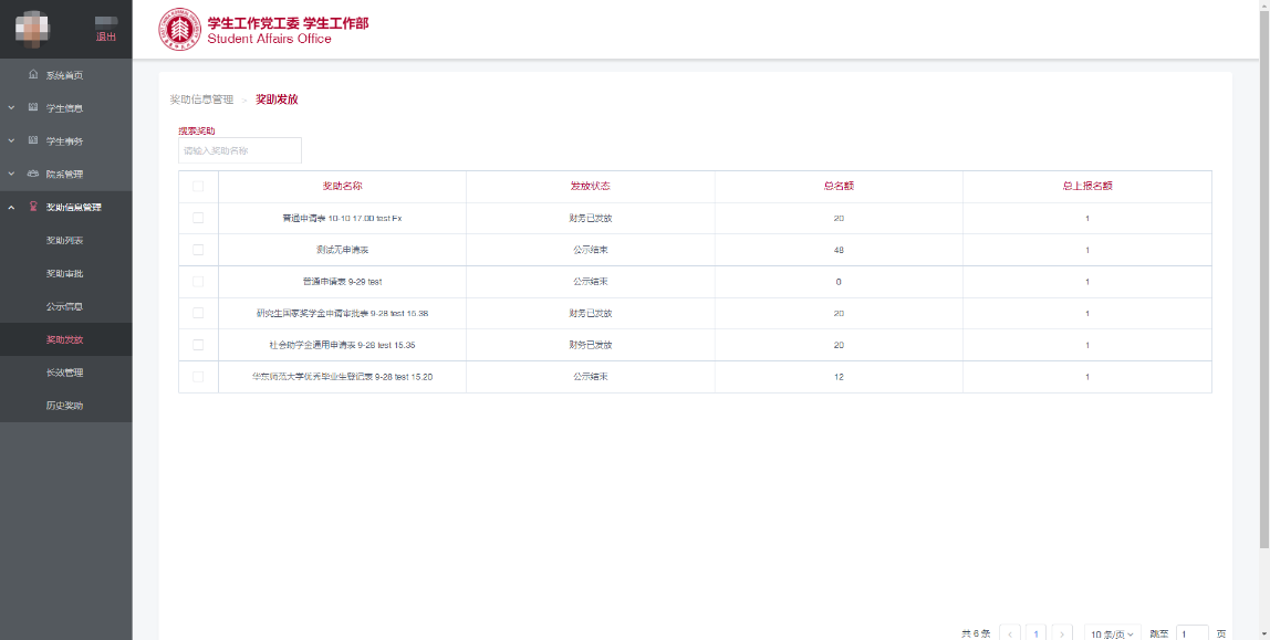 在左侧“奖助信息管理”一栏中,点击“奖助发放”进入页面,列表中展示了已发放的奖助信息(图5.1)。