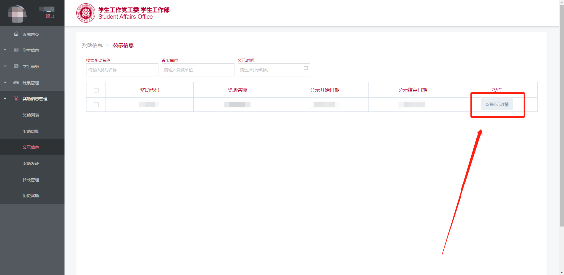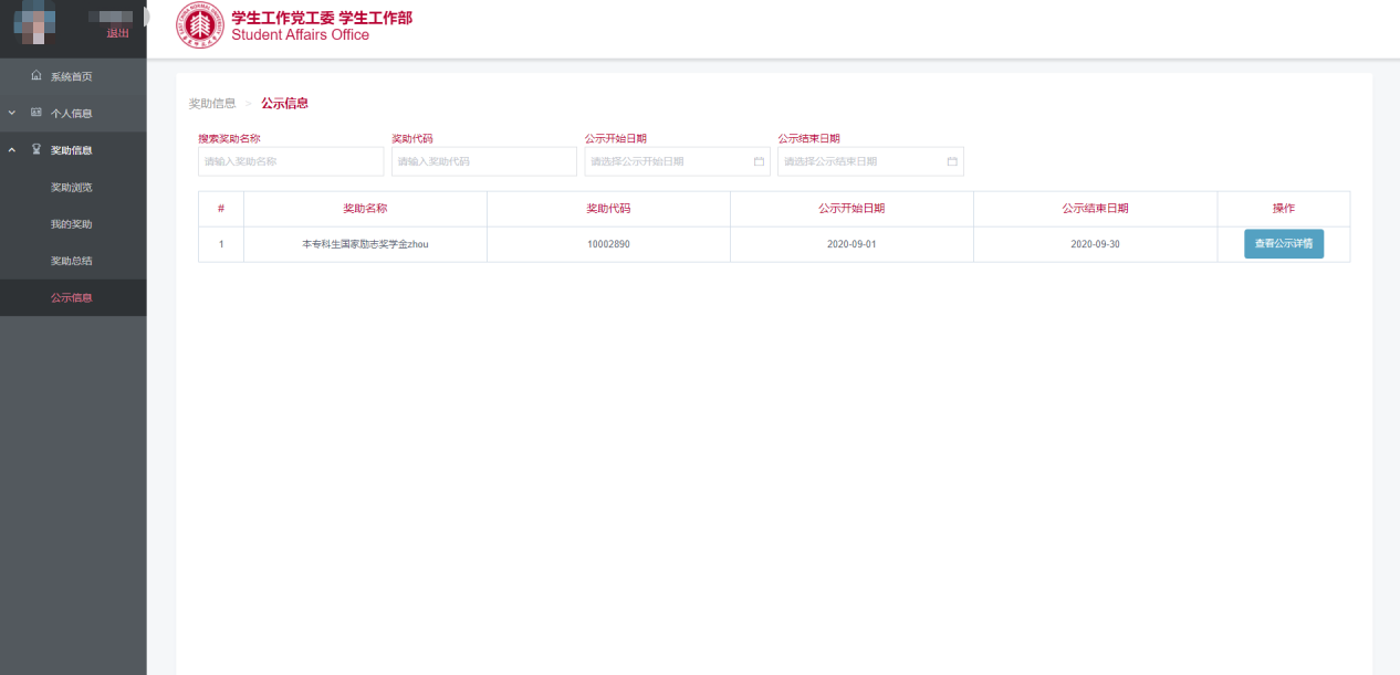 在左侧“奖助信息”一栏中,点击“公示信息”,可以查看正在进行全校公示的奖助学金,点击“查看公示详情”查看获奖助学生名单(图5.1)。