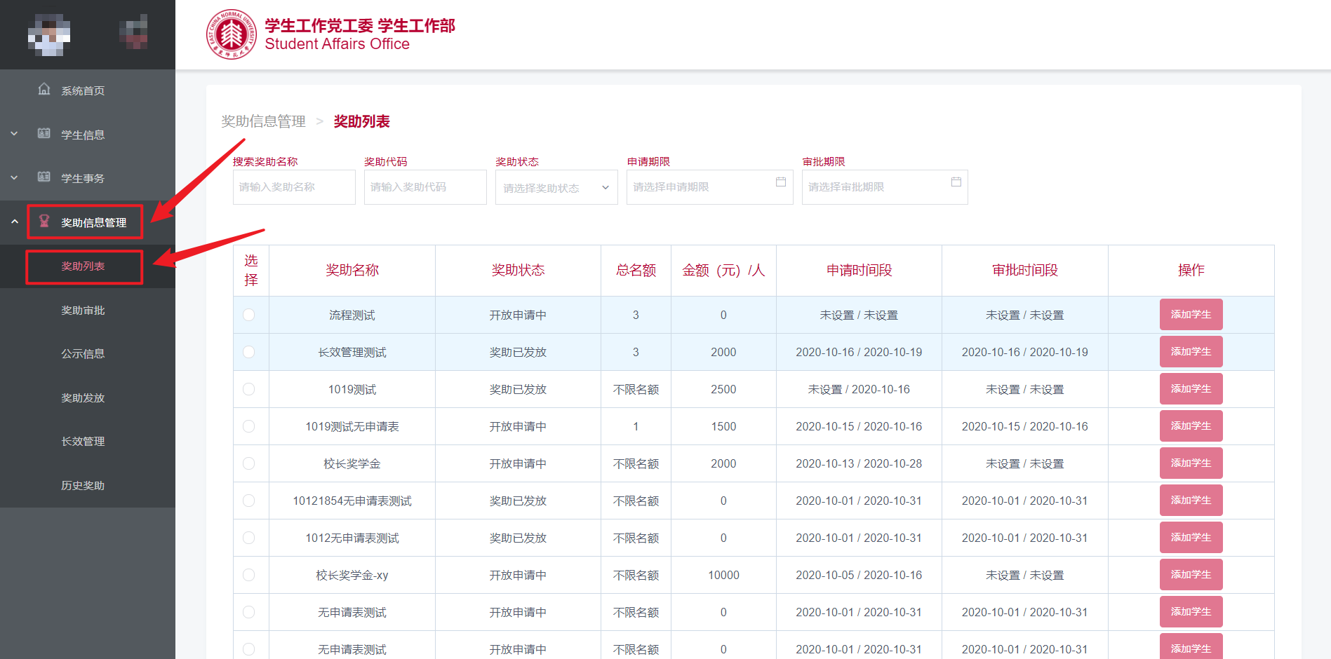 在登陆后的首页点击“奖助管理”(图2.2),也可快速进入“奖助列表”页面(图2.2)。
