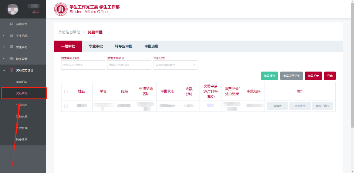 在左侧“奖助信息管理”一栏中,点击“奖助审批”(图3.1),列表中展示了申请该院系奖助的申请信息,包括申请人、申请奖助名称、奖助审批状态等。