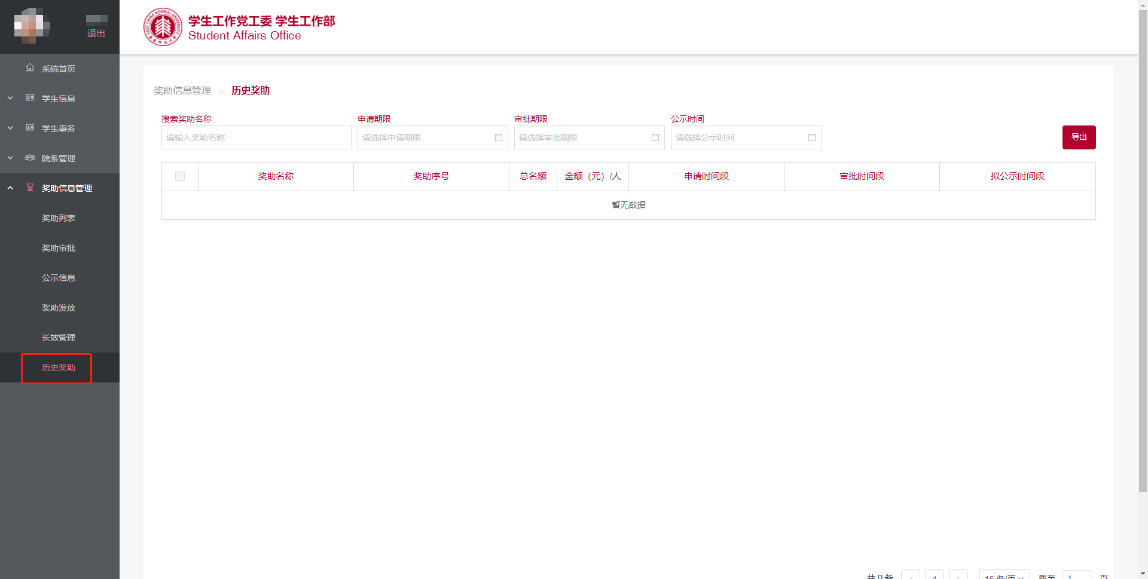 在左侧“奖助信息管理”一栏中,点击“历史奖助”菜单进入页面(图7.1),列表中展示了已经被系统管理员归档的奖助信息。