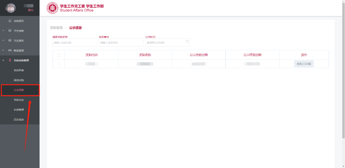 在左侧“奖助信息管理”一栏中,点击“公示信息”进入页面,列表中展示了所有正在公示的奖助信息(图4.1)。