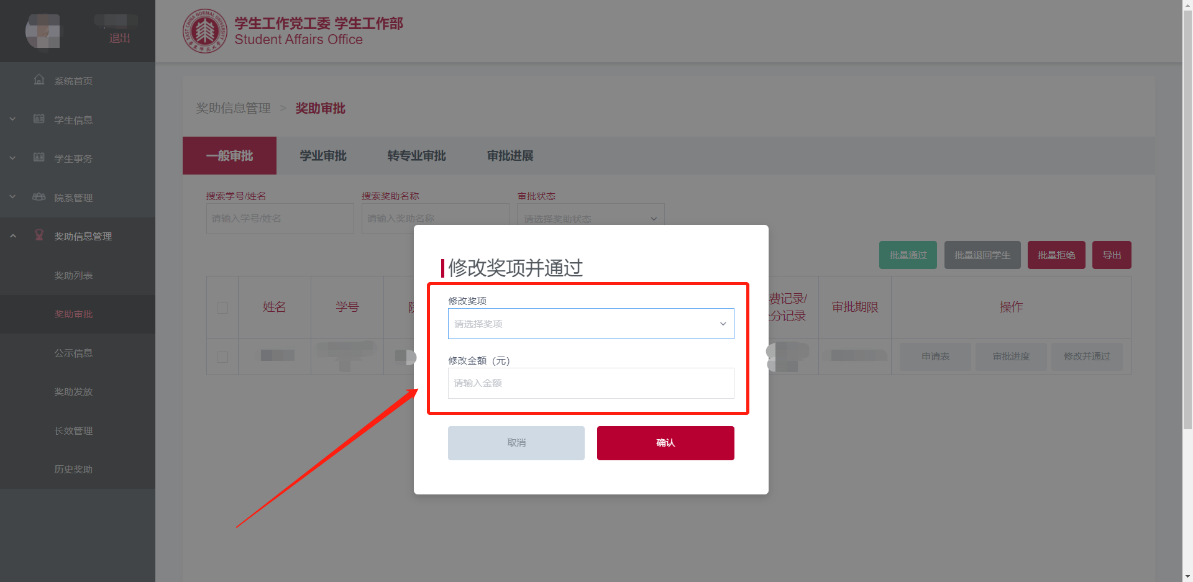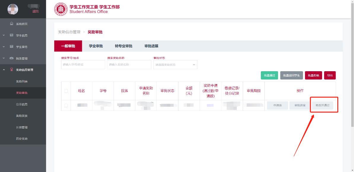 管理员可以单独通过学生的申请记录,并对奖项进行修改。具体操作如下:
