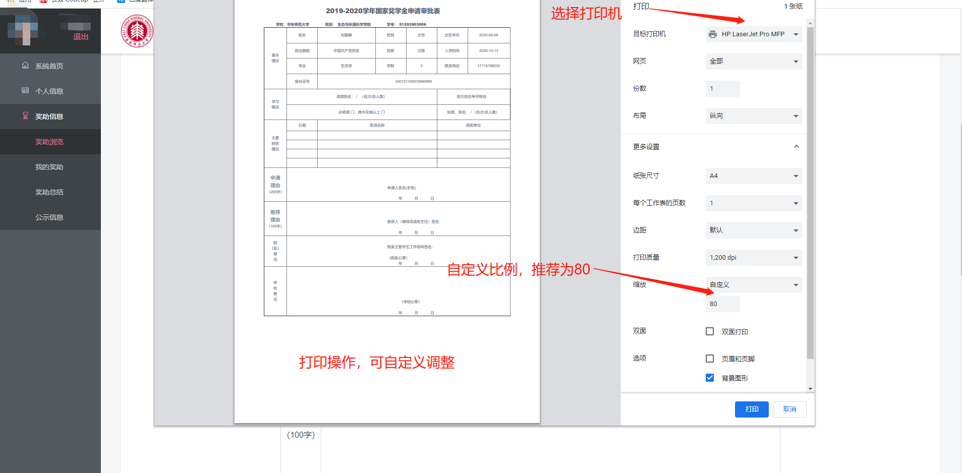 点击“打印”按钮可以直接调用局域网中的打印机打印申请表格(图2.5),建议将打印比例自定义调整为80。