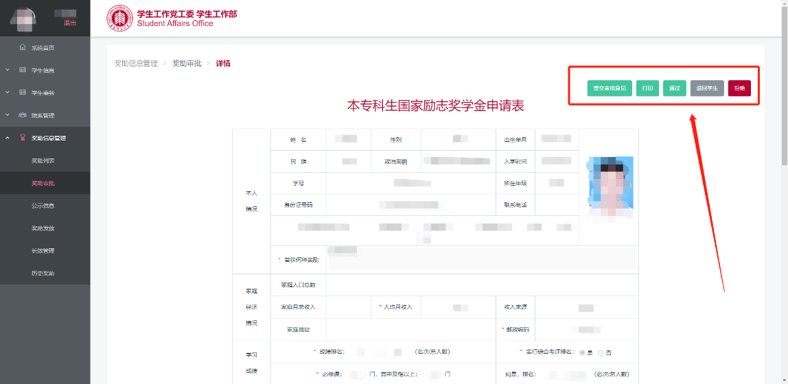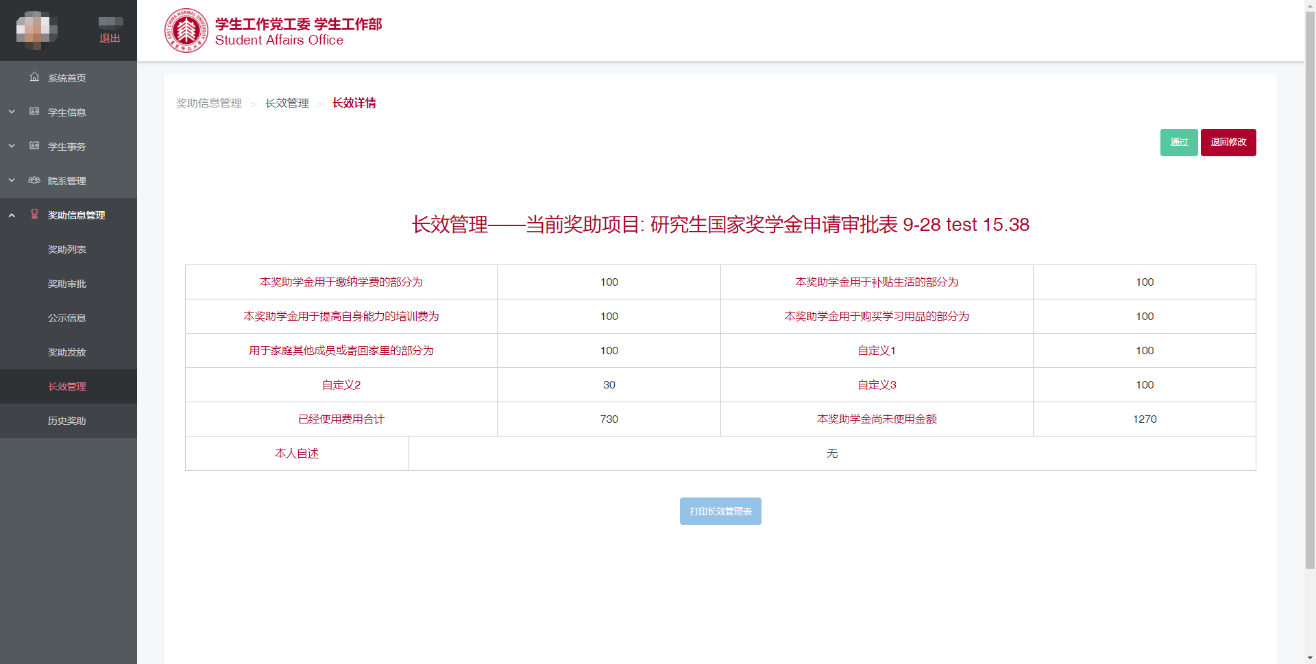 管理员可以查看申请人提交的奖助申请表,同时可以进行“打印”、“通过”、“退回学生”等后续操作(图3.7)。