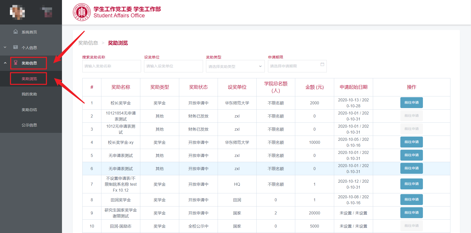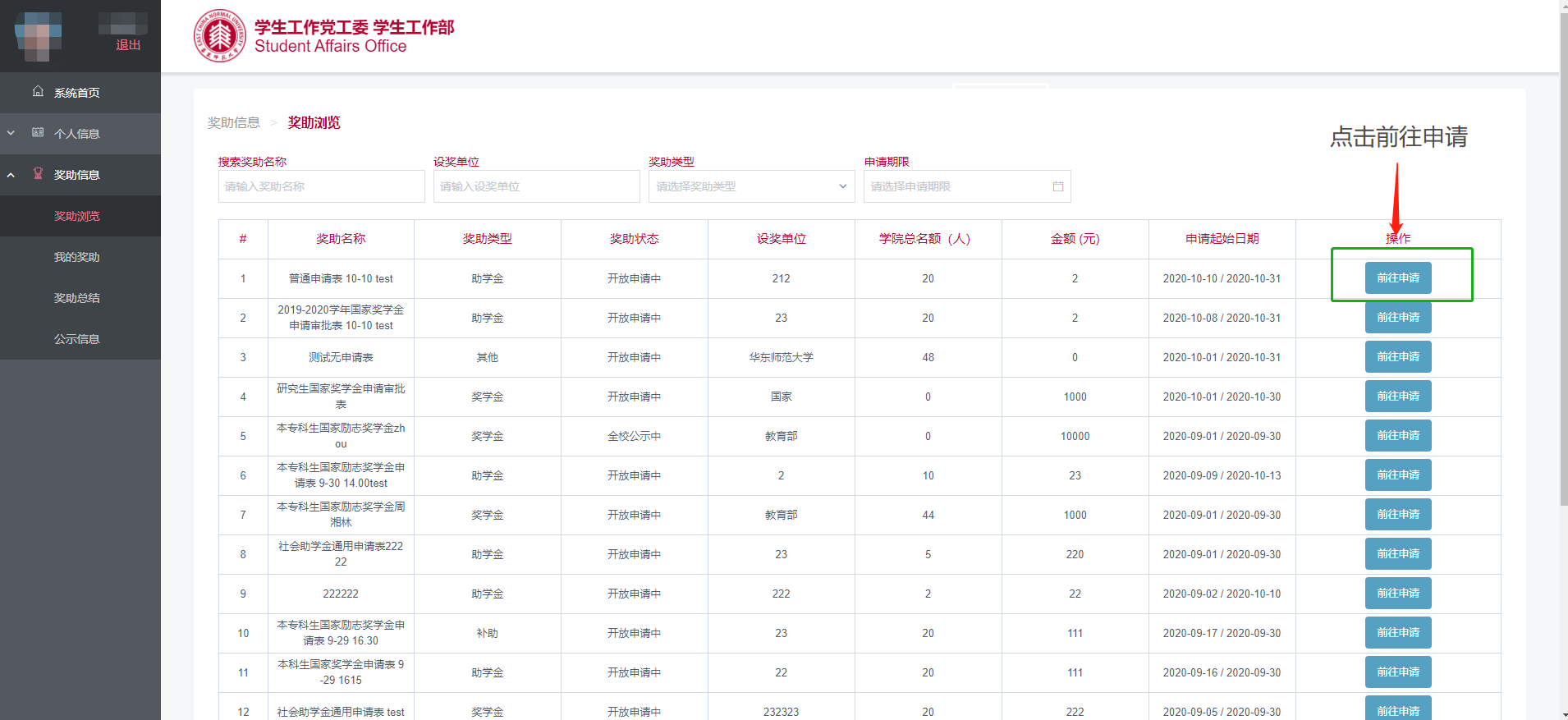 在“奖助浏览”界面,点击对应条目右侧的“前往申请”申请该奖助(图2.2),如果不符合资格,浏览器顶部会有对应的提示信息。