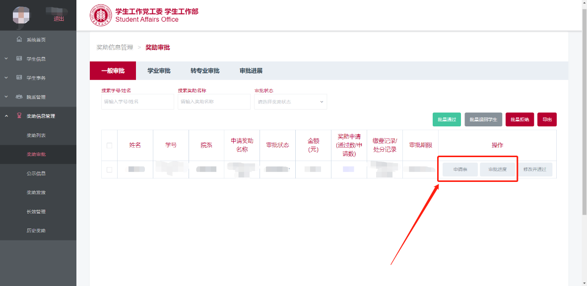 管理员可以查看申请记录的学生申请表以及审批进度,点击对应记录右侧的“申请表”可进入申请表详情页面,点击“审批进度”可查看奖助审批当前进度(图3.4)。