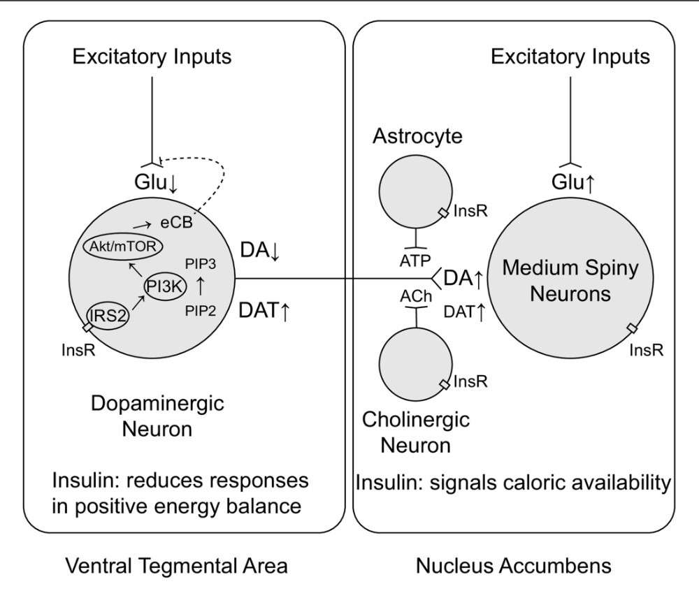 中脑边缘多巴胺通路是脑内奖赏系统最重要的组成部分之一。在过去的几十年中,该通路已经被证明在奖赏搜索、强化学习、行为动机和执行控制等方面起到关键作用。胰岛素作为调节饮食摄入的主要肽类,可以跨越血脑屏障,直接作用于中枢奖赏系统的中脑边缘多巴胺通路。