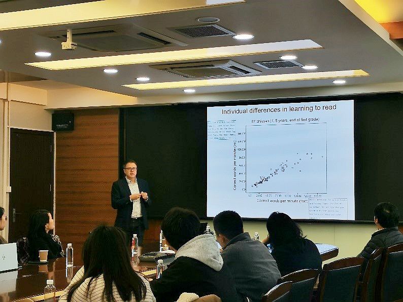 Maurer副教授首先介绍了阅读的个体差异以及词语加工的脑机制。根据其早期脑电研究发现,相对于符号字符串,二年级儿童在ERP中N1成分对(词水平的)文字响应更大,说明了阅读视觉经验的发展。Maurer副教授团队将该阅读调节范式用于失读症成人中,发现相对于不熟悉的韩语,成人左侧颞皮层对汉语(熟悉语言)的N1启动(onset)增强,结束(offset)减弱,这与上述儿童研究中由于视觉经验导致的N1增强结果一致。但是在年龄较大的儿童和成人的研究中发现这种阅读调节(tuning)效应相较于二年级儿童再次下降,这表明随着阅读技能的提高,需要的神经元资源更少。