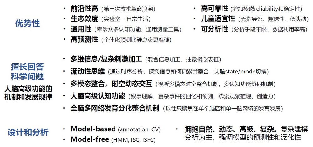 报告中,汪寅研究员结合各个领域的相关文献,系统介绍了自然刺激范式的优越性、自然刺激擅长回答的科学问题、自然刺激的设计与分析和自然刺激的局限和挑战。相比于传统任务态范式和静息态范式,自然刺激范式具有科学前沿性、相对更高的生态效度、全面性、高预测力、高可靠性、儿童适宜性以及高度的可分析性。借助自然刺激,研究者可以用来回答高度复杂的多维信息加工、流动性思维、多模态整合、叙事理解等高级认知功能、全脑多网络发育分化整合机制和大脑的AI建模等相关研究问题。目前的自然刺激范式设计上会更加自然、动态、高级和复杂,具有高生态效度特征,不采用对照设计,并且尽量避免控制各类因素。在分析时,通过建模来预测全脑工作机制,更加强调模型的预测性和泛化性。