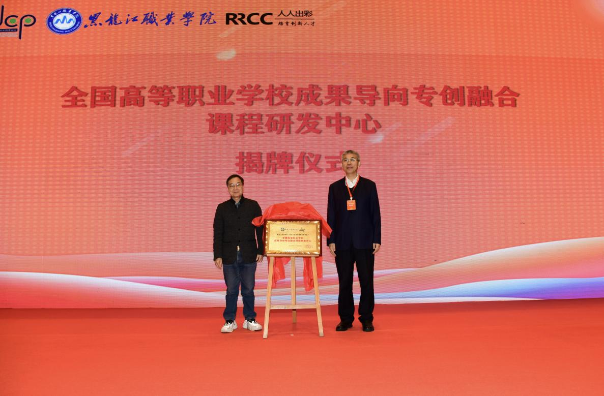 仪式现场,全国高等职业学校校长联席会议秘书长任君庆宣读了在黑龙江职业学院成立“全国高等职业学校成果导向专创融合课程研发中心”文件,同时,在场与会嘉宾共同见证了“全国高等职业学校成果导向专创融合课程研发中心”揭牌仪式。