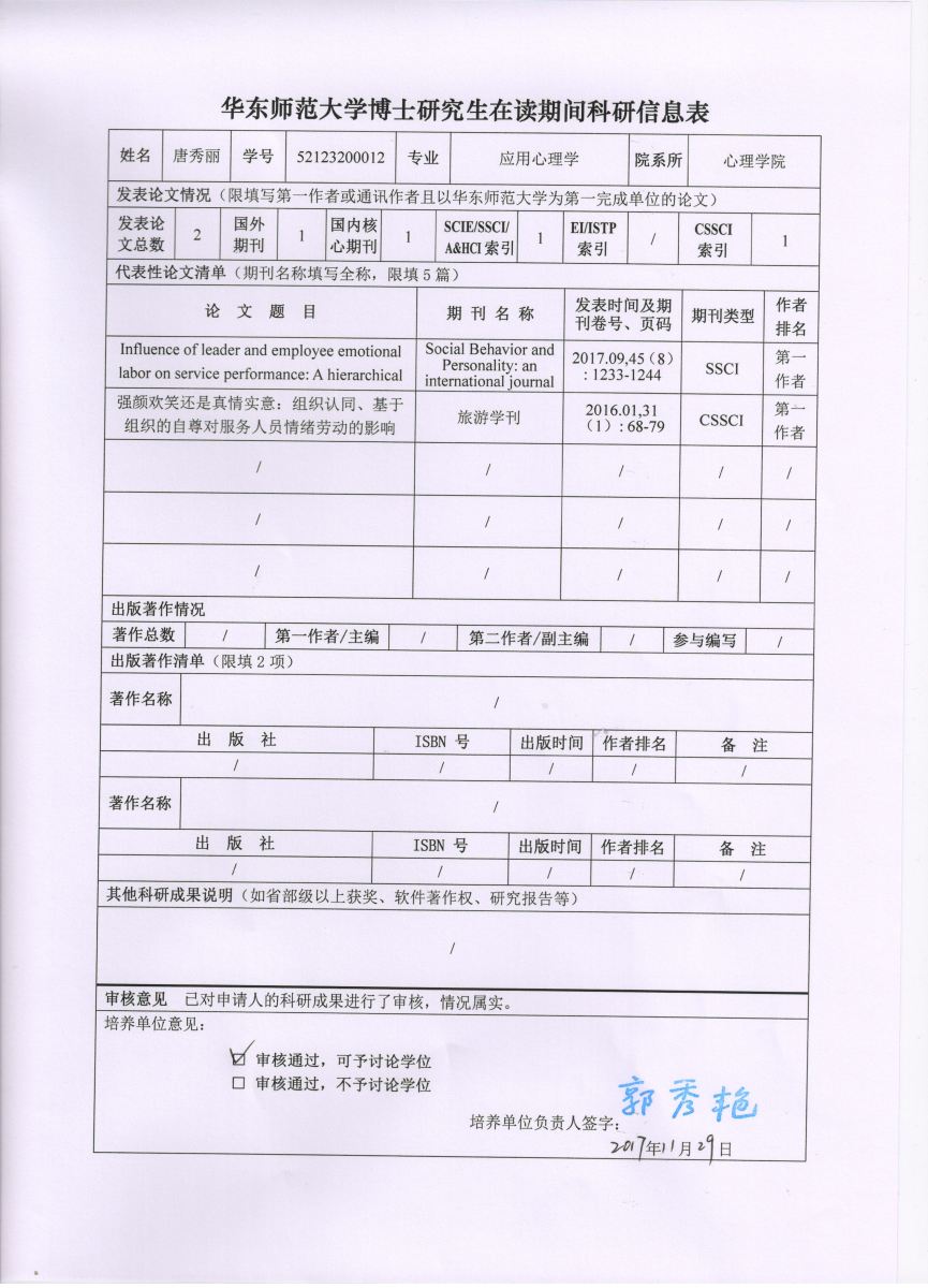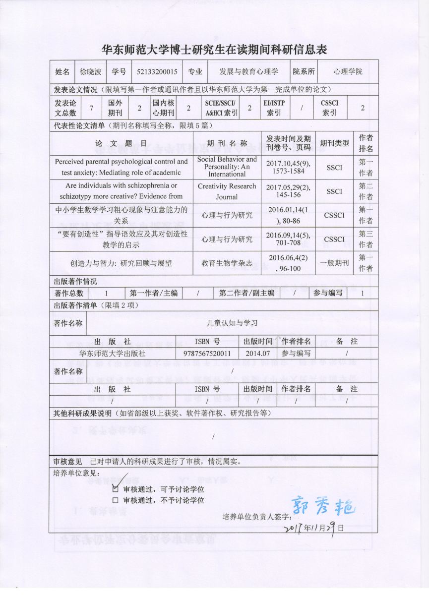 根据《6686体育关于2017-2018学年第一学期博士研究生科研成果审核的通知》,另增两位博士研究生科研成果信息(见附件)予以公示,公示时间为11月28日至12月5日。公示期间如有异议,请向研究生教学办公室白老师进行反映,联系邮箱:llbai@psy.ecnu.edu.cn,办公地点:俊秀楼202室。 心理学院研究生教学办公室 2017年11月28日