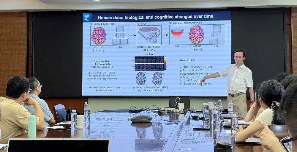 Marcus Kaiser教授首先介绍了聚焦超声(FUS)的关键优势:它能够安全、精准地刺激大脑深部区域(如海马体、杏仁核、基底节等),同时又规避了侵入性脑植入手术的风险。这种非侵入性神经调控技术使其广受患者和公众青睐,调查显示FUS因其安全性被列为干预方式的首选。