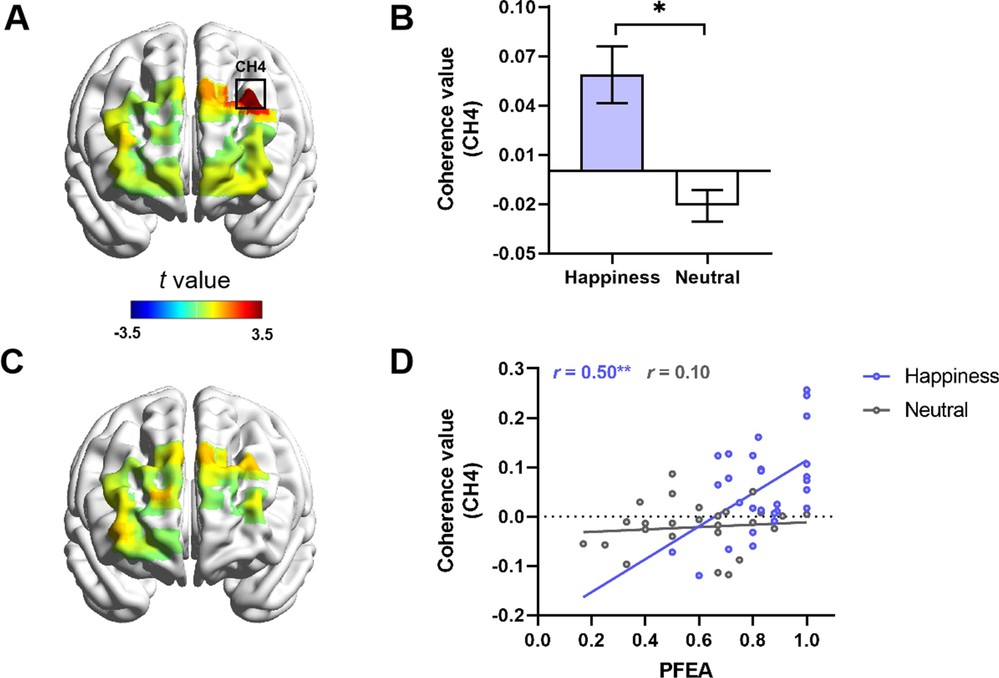 图3. 按键任务中神经活动同步性的情绪效应。 (A) 两种情绪下合作任务的神经活动同步性比较热图;(B) 两种情绪下显著通道(CH4) 神经活动同步性差异比较;(C) 两种情绪下竞争任务的神经活动同步性比较热图;(D) 快乐情绪下PFEA 与神经活动同步性呈正相关。