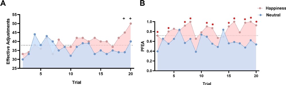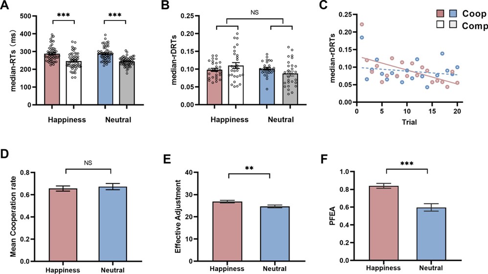 图1. 按键任务行为学结果。(A) 快乐和中性情绪条件对人际合作和竞争任务的反应时。(B) 相对反应时之差。(C) 两种情绪下相对反应时之差随任务试次动态变化效应。(D) 两种情绪下平均合作率。(E) 两种情绪下合作任务的有效调整次数。(F)两种情绪合作失败后的有效调整率(PFEA)。