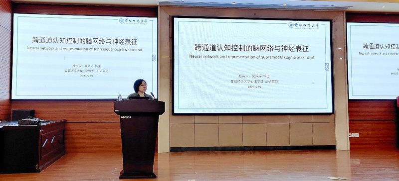 2023年5月29日下午,我院在俊秀楼223报告厅举办建院十五周年系列讲座,特邀首都师范大学心理学院的吴婷婷副研究员作题为“跨通道认知控制的认知神经机制”的学术报告。报告由罗艺研究员主持,相关领域的青年教师、研究生和本科生50余人参加了本次报告会。