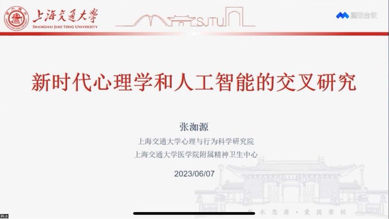 2023年6月7日下午,上海交通大学心理与行为科学研究院与上海市精神卫生中心双聘副研究员张洳源博士应邀来到我院,在俊秀楼105会议室,为我院“心理学+计算机”双学位班和耀翔班作了题为“新时代心理学和人工智能的交叉研究”的学术讲座。讲座由我院胡杨副教授主持,双学位班、耀翔班以及其他感兴趣的校内外师生分别通过线上线下方式参与了本次活动。
