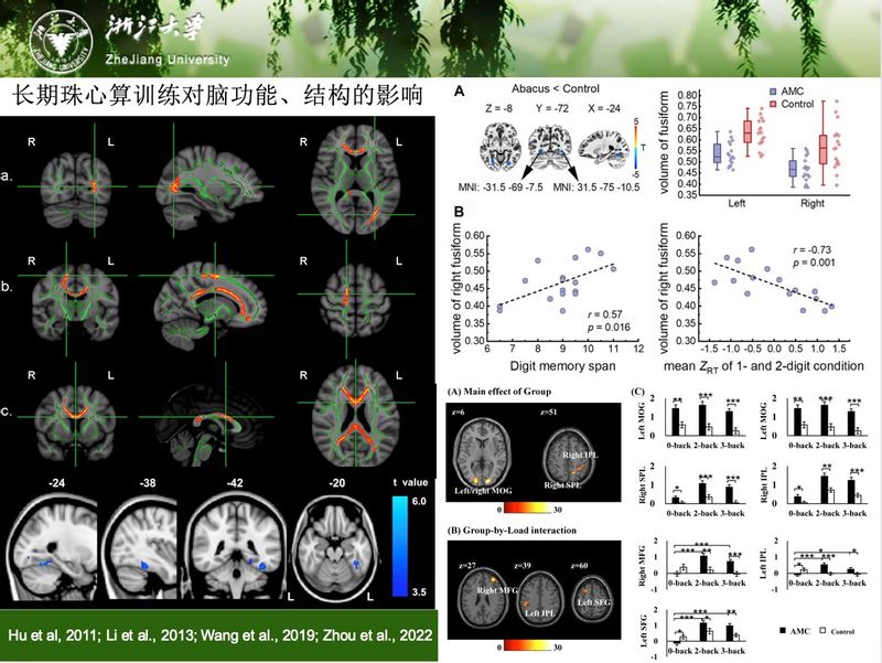 在报告中,陈飞燕教授探讨了在小学阶段,随着年龄的增长,珠心算训练如何影响儿童领域一般性认知能力和领域特殊性数字加工能力的发展,以及两者对数学能力的影响。陈教授团队在研究中还发现长期训练可以提升任务条件下额顶网络脑活动的神经效能,以及静息态下梭状回的网络局部效率,且训练得越好的个体,这种效果会越明显。