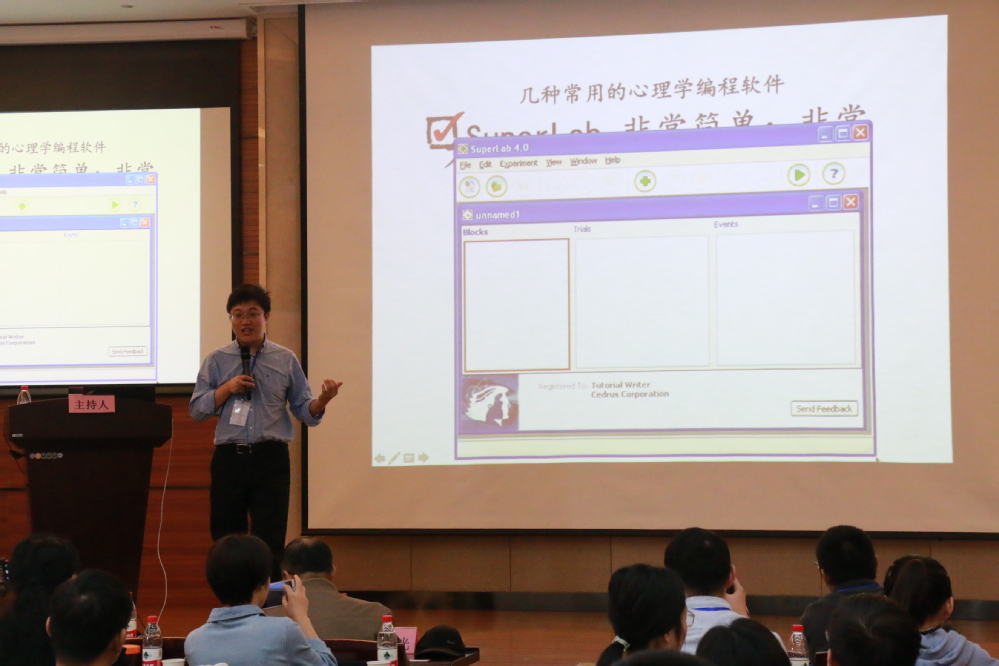 苏州大学教育学院心理学系张阳教授为我们带来了“PTB-Builder 0.1:一个免费的图形界面Psychtoolbox编程系统”的报告,提出目前常用的心理学编程软件固有的特点和缺陷,介绍并现场演示了该团体开发的一套基于Psychtoolbox的图形界面编程系统的特点和使用,用户无需任何编程经验,仅需要简单的拖拽就可以在短时间内编制出功能强大、经过优化的标准化实验程序,极大程度解决了编程成本这一困扰很多心理学科研工作者的问题,并促进了实验编程的标准和简易化。