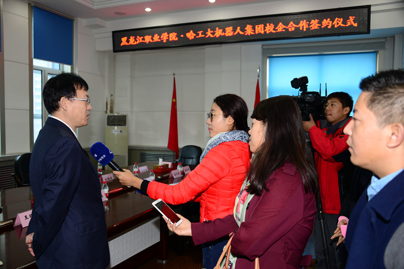 签约仪式后,于沐琳与白相林接受黑龙江省电视台《新闻联播》《新闻夜航》栏目、黑龙江日报等多家新闻媒体采访,并共同参观了电气工程学院实训室。