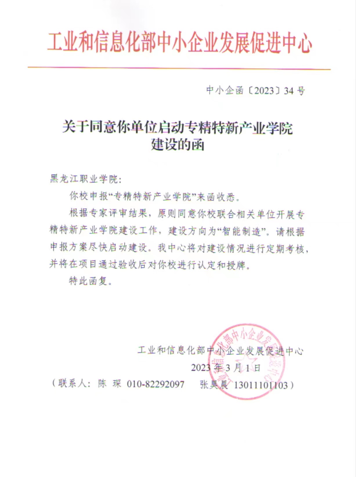 此次申报工作,学校党委高度重视,校领导全程指导,科研与校企合作处、学校办公室给予政策和文件辅导。根据《专精特新产业学院建设指南(试行)》要求,智能制造技术学院联合专精特新企业哈工大机器人创新中心有限公司、黑龙江省中小企业发展服务中心和黑龙江省中小企业协会共同申报“黑龙江职业学院智能制造专精特新产业学院”。