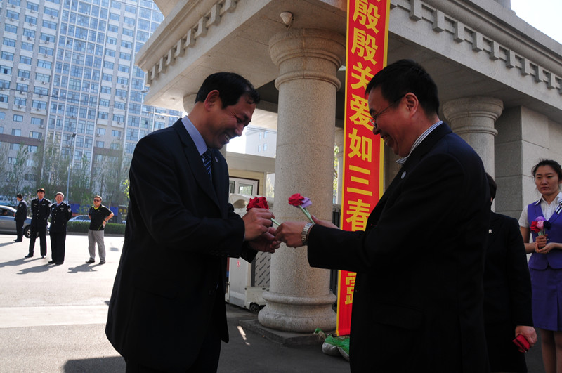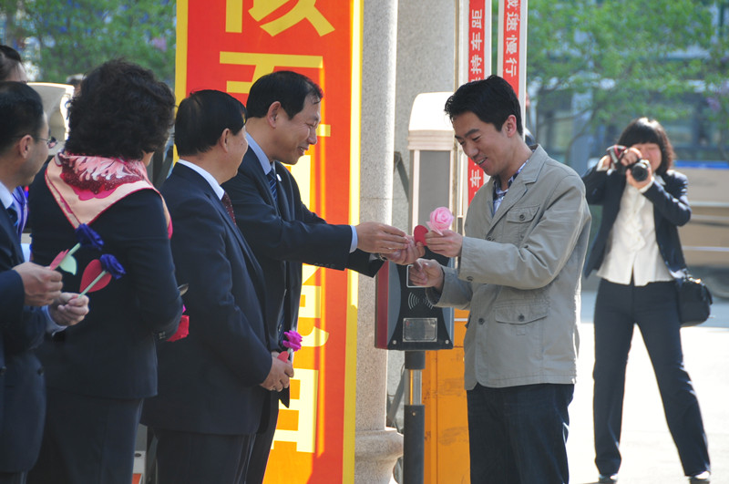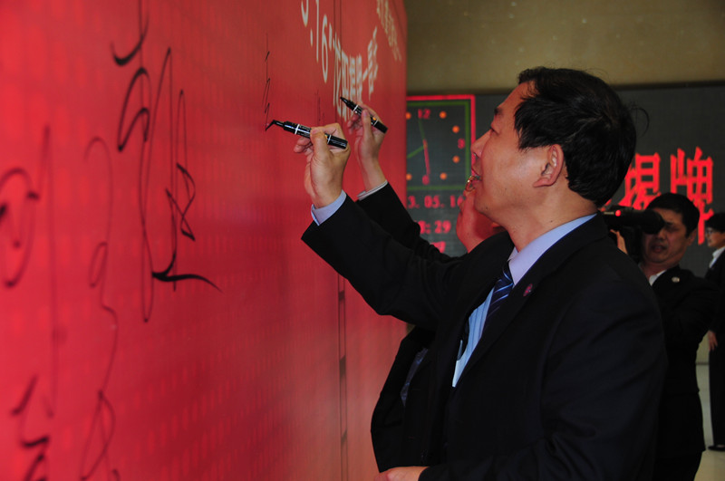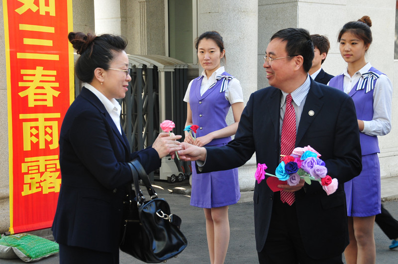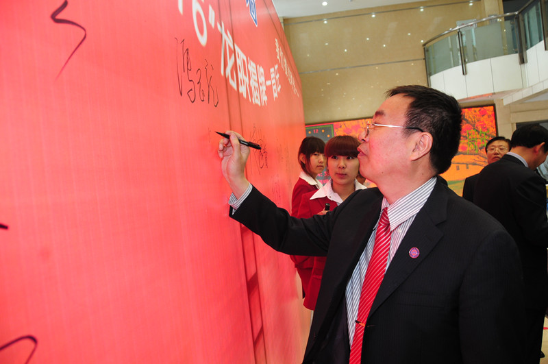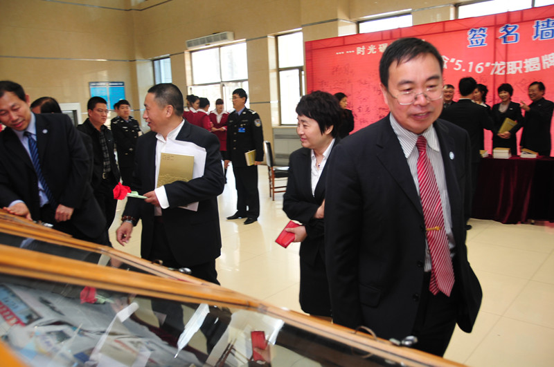 7:30,校园内校旗迎风招展,在学院大门,映入眼帘的是两侧悬挂崭新对联:“纪念五一六书记笑迎教师表殷殷关爱如三春雨露,揭牌一周年院长喜接员工倾惓惓尊重似五月艳阳”,学院领导和各部门党政负责人近60人在校门迎接师生步入校园,送上学院领导对教职员工的感谢、尊重、关怀和温馨祝福。学院团委学生干部为教职工送上了他们连夜手工制作的花束表达崇敬之情。随后,师生在主楼大厅设立的纪念“5·16”龙职揭牌一周年签名墙上签名留念。同时,“5·16”揭牌史料展吸引人们关注,八个展柜,一件件展品,充满了亲切和怀念,令人难以忘怀那些激动的日子。