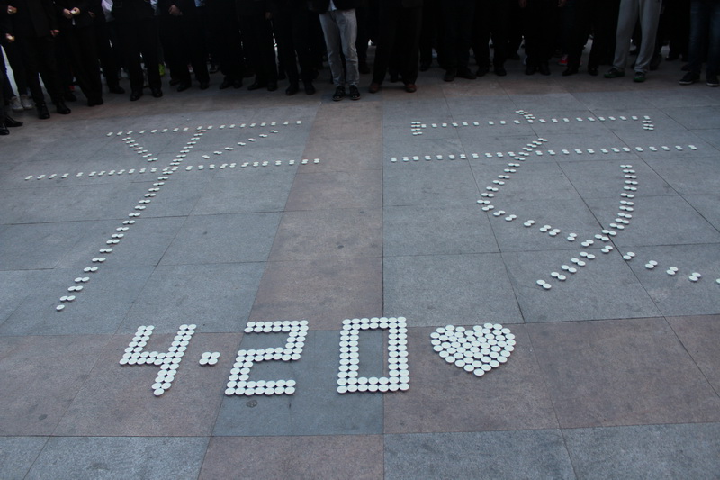 活动当晚,同学们身着素装,神情凝重,手持白色蜡烛肃立,在广场上点亮了数百只蜡烛摆成的“平安”、“4·20”和心形的字样。18:30,默哀仪式正式开始,在场所有同学为雅安地震默哀3分钟,寄托自己的沉痛和祝愿。主持人播报了雅安地震灾情的最新情况,并且讲述了地震中发生的一幕幕感人的瞬间,许多同学潸然泪下。同学们打出了“平安中国、平安雅安”的条幅标语,并以口号、倡议书等各种形式,表达对雅安同胞们的悼念之情。活动共吸引了近500名同学参加,现场的气氛庄严肃穆。