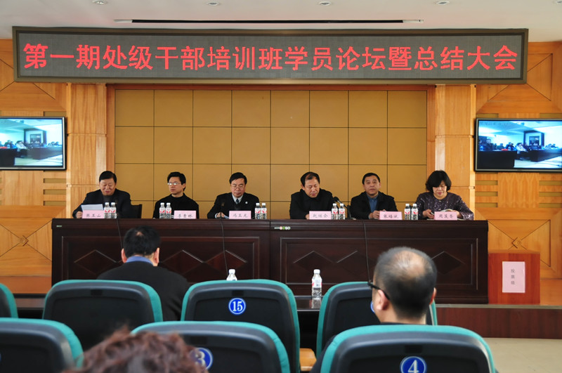 党委书记冯玉龙做了重要讲话。他在讲话中指出:按照全省干部教育培训工作会议精神,以提升能力和素质为目标,学院高质量启动了校内干部教育培训工作,成立了“龙职讲坛”,组织开展了“第一期处级干部培训班”,邀请院内外领导和专家做了7场专题讲座,印制了学习材料、确定了必读书目。冯书记总结这期培训班的特点:一是党委高度重视。学院党委高度重视这期培训班的工作,把处级干部培训作为增强干部党性锻炼,提升处级干部领导力、执行力和综合素质的有效途径。二是培训内容丰富。几个月来,党委党校共安排“党的十八大精神宣讲”、“提高领导干部执行力”、“领导干部沟通能力”、“领导干部心理调适”等7讲内容,最后还举办了“学员论坛”和“处级干部学习笔记成果展”等。三是培训长效机制基本建立。坚持集中培训和日常培训相结合,积极探索建立学院处级干部培训的长效机制,成立了“龙职讲坛”培训平台。利用“龙职讲坛”每月开展一次讲坛活动,打造学院干部教育培训品牌,促进学院干部教育培训工作经常化。四是组织严密有序。党委组织部作为学院干部教育培训工作的职能部门,做了大量的组织协调工作。全体处级干部也都积极克服工学矛盾,自觉遵守学习纪律,坚持参加培训活动,确保了培训的效果和质量。