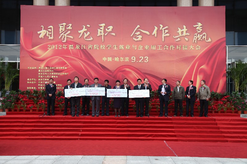 9月23日,由省工信委、省教育厅、省人力资源和社会保障厅、黑龙江人民广播电台联合主办,我院承办的以“相聚龙职、合作共赢”为主题的2012年黑龙江省院校学生就业与企业用工合作对接会在学院隆重举行。省工信委党组书记贲起利、常务副主任庞光明,省人力资源和社会保障厅副厅长董绍林,黑龙江人民广播电台专职编委韩巨生,省农垦总局副局长谭占龙,省教育厅学生处处长张明华,黑龙江职业学院书记冯玉龙、院长赵继会,黑龙江信息技术职业学院院长武英举以及中国移动哈尔滨分公司党委书记、总经理潘景波出席大会。262家省内外重点骨干企业和省内101所院校代表及各高校应届毕业生参加此次会议。会议由省工信委纪检组组长王涛同志主持。