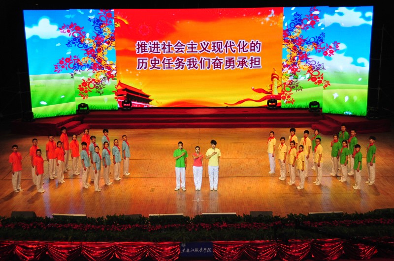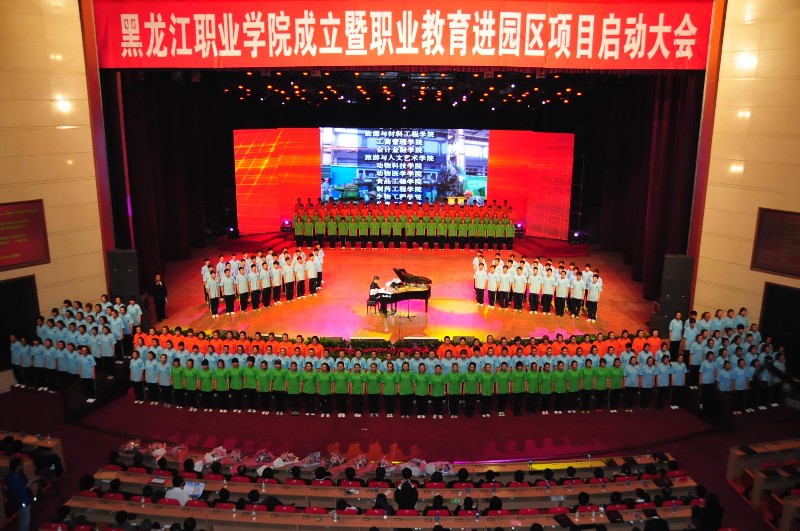 会议结束后,举行了以“腾飞龙职”为主题的文艺演出,有关领导、学院师生和企业代表同台庆祝黑龙江职业学院的成立和职业教育进园区项目启动。最后,在原中国歌剧院院长刘锡津教授的指挥下,全体合唱了由学院党委书记冯玉龙作词、刘锡津教授作曲的校歌--《龙职之歌》,将演出推向高潮。