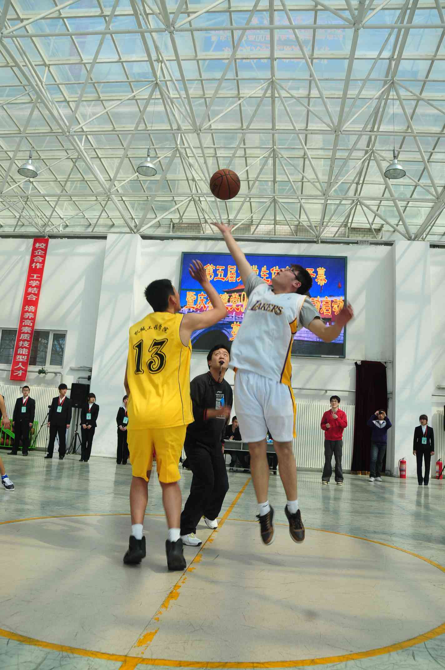 剪彩仪式后,体育节第一项赛事“创新杯”大学生篮球赛在校园文化活动中心篮球场馆进行了首场比赛。
