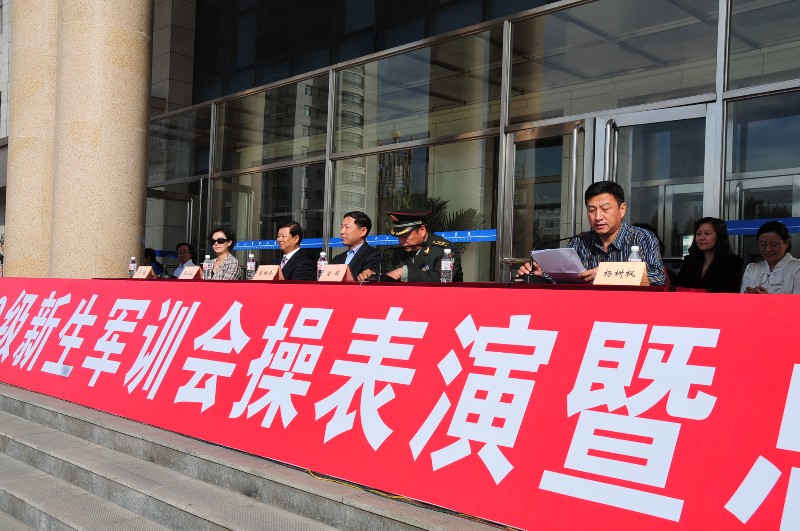 9月19日8:30,学院2010级新生军训会操表演暨总结大会在体育场隆重举行。六五四二六部队副参谋长金辉同志、省教育厅体卫艺处副处长卢瑛同志应邀出席。学院院长赵继会同志、党委副书记张玉山同志、有关处室负责人以及各系主任、副主任、2010级全体辅导员参加了会议。会议由校园文化部主任杨树枫同志主持。