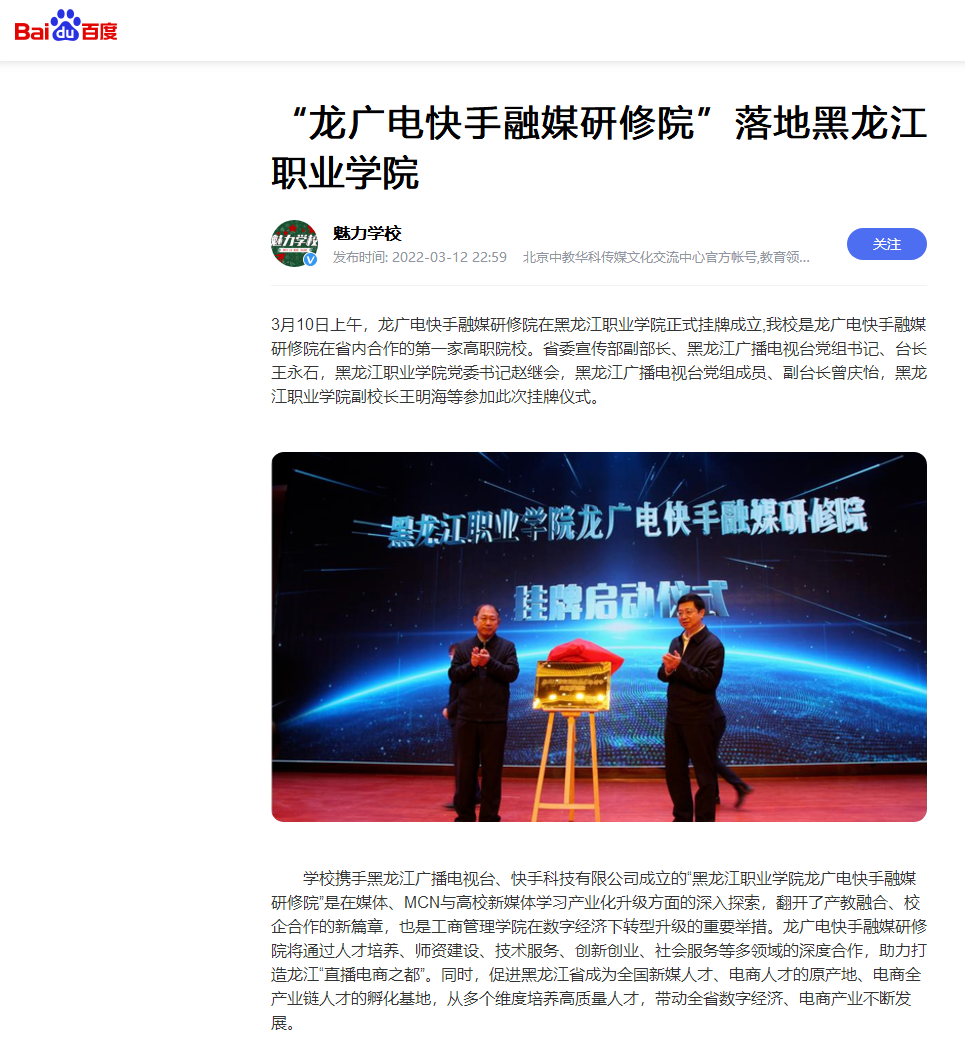 【百度】“龙广电快手融媒研修院”落地黑龙江职业学院