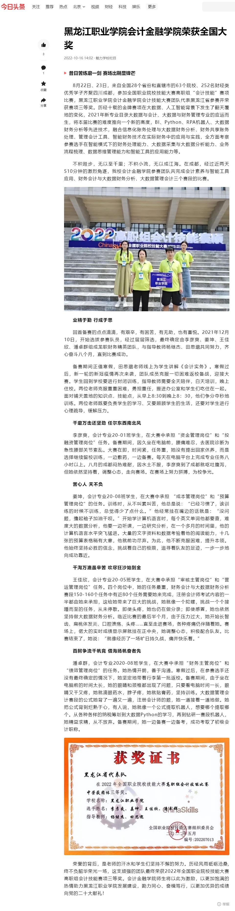 【搜狐新闻】黑龙江职业学院会计金融学院荣获全国大奖