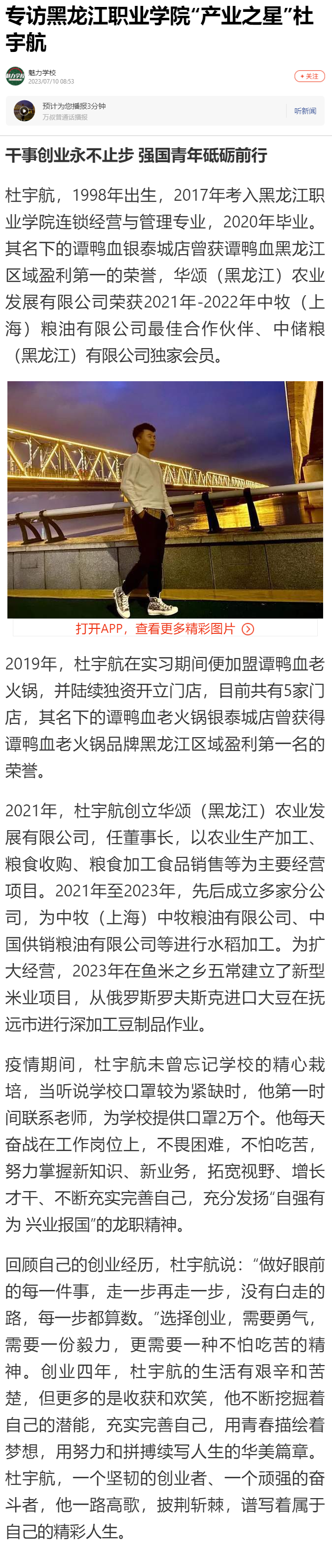 【搜狐新闻】专访黑龙江职业学院“产业之星”杜宇航