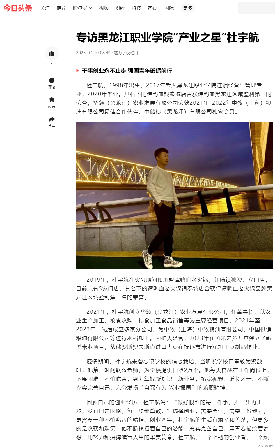 下一篇:【新浪新闻】专访黑龙江职业学院“产业之星”杜宇航