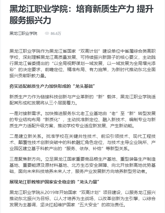 下一篇:【新华社黑龙江频道】黑龙江职业学院依托国家智慧教育公共服务平台创新“一核三线六精神”育人模式