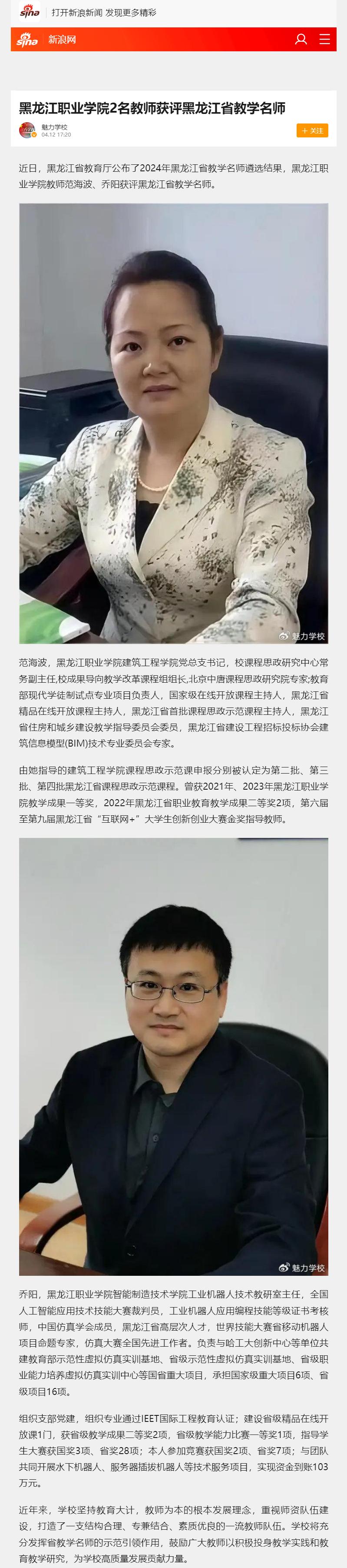 【新浪新闻】黑龙江职业学院2名教师获评黑龙江省教学名师
