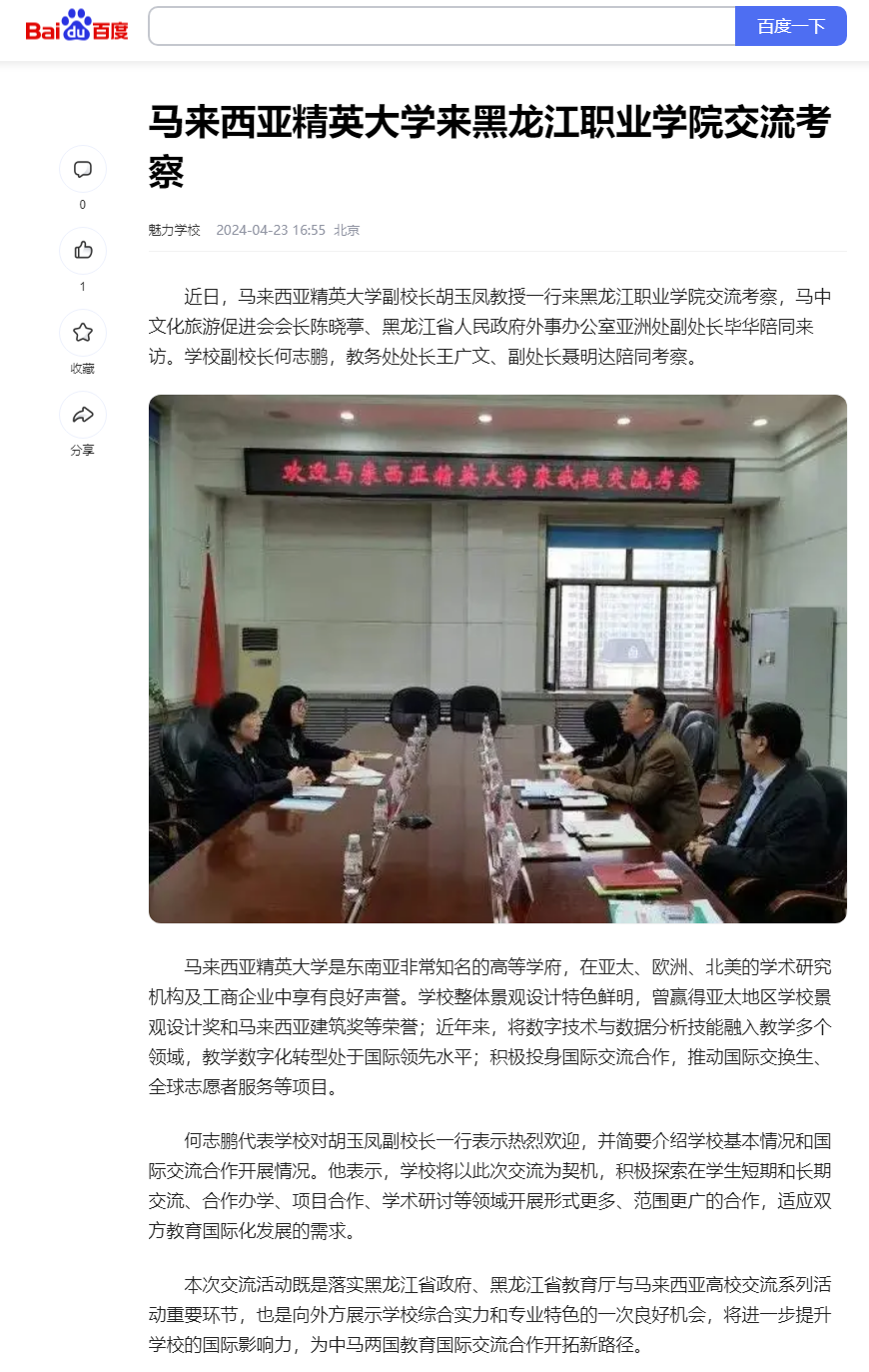 【百度新闻】马来西亚精英大学来黑龙江职业学院交流考察