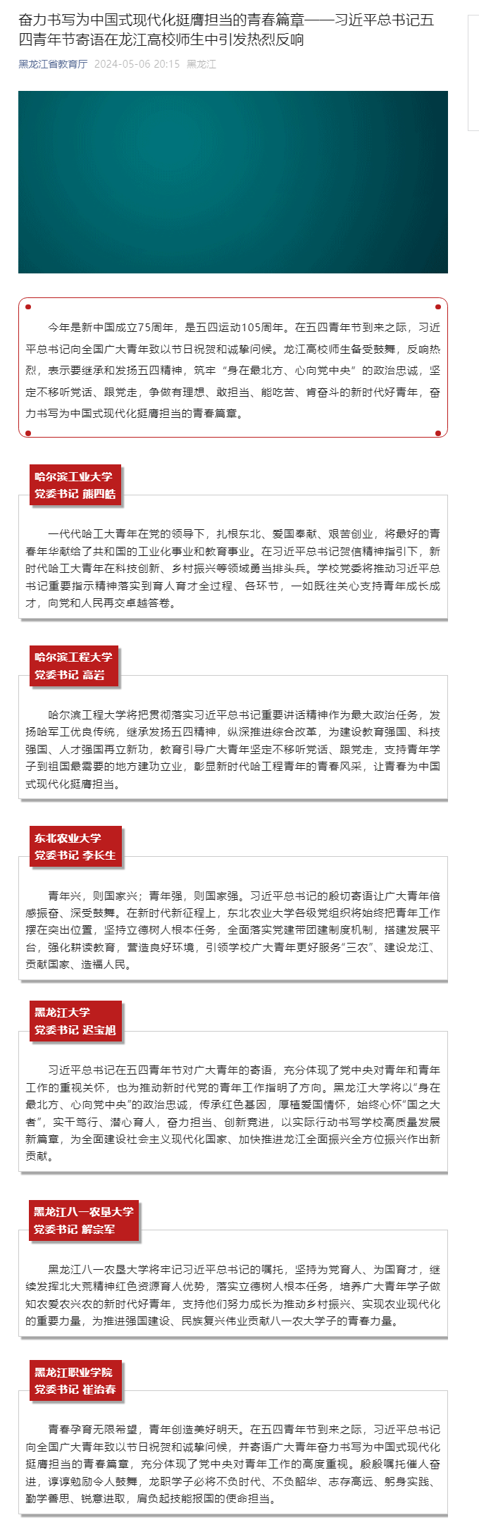 【黑龙江省教育厅】奋力书写为中国式现代化挺膺担当的青春篇章——习近平总书记五四青年节寄语在龙江高校师生中引发热烈反响