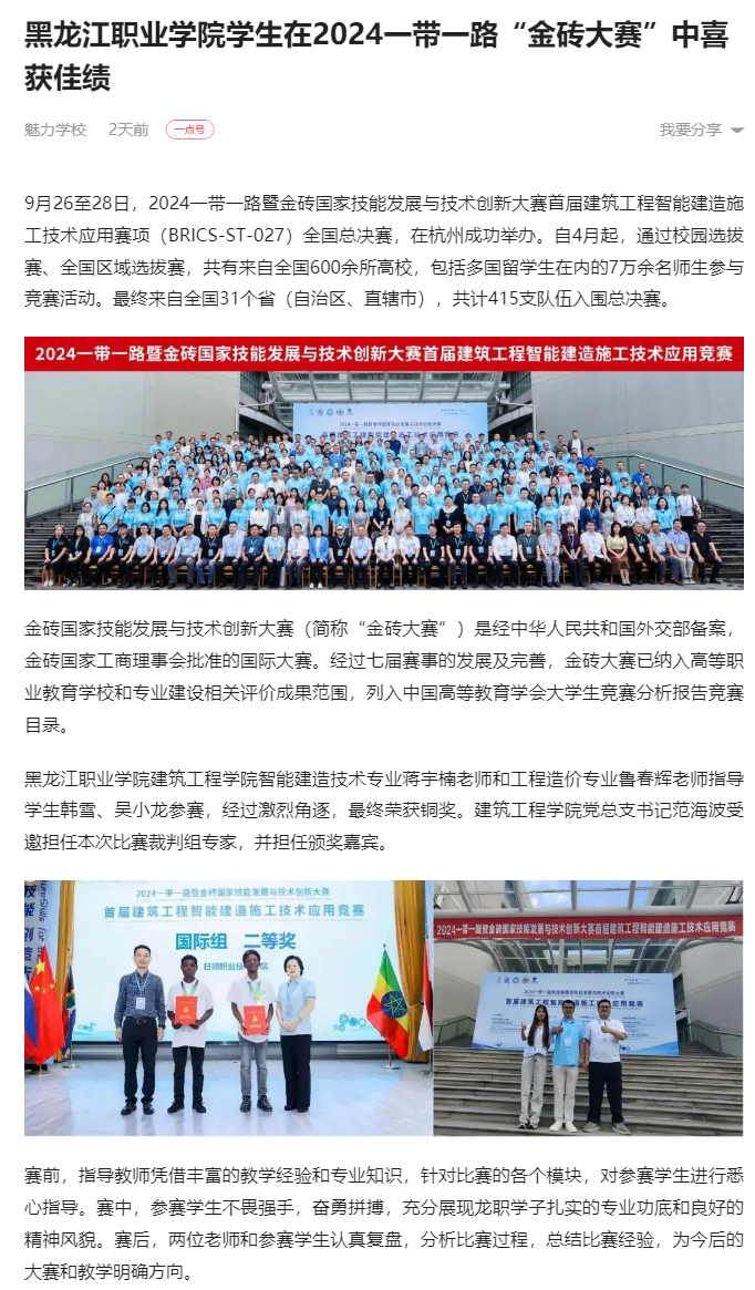上一篇:【百度新闻】黑龙江职业学院学生在2024一带一路“金砖大赛”中喜获佳绩