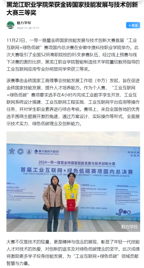 下一篇:【一点资讯】黑龙江职业学院荣获金砖国家技能发展与技术创新大赛三等奖