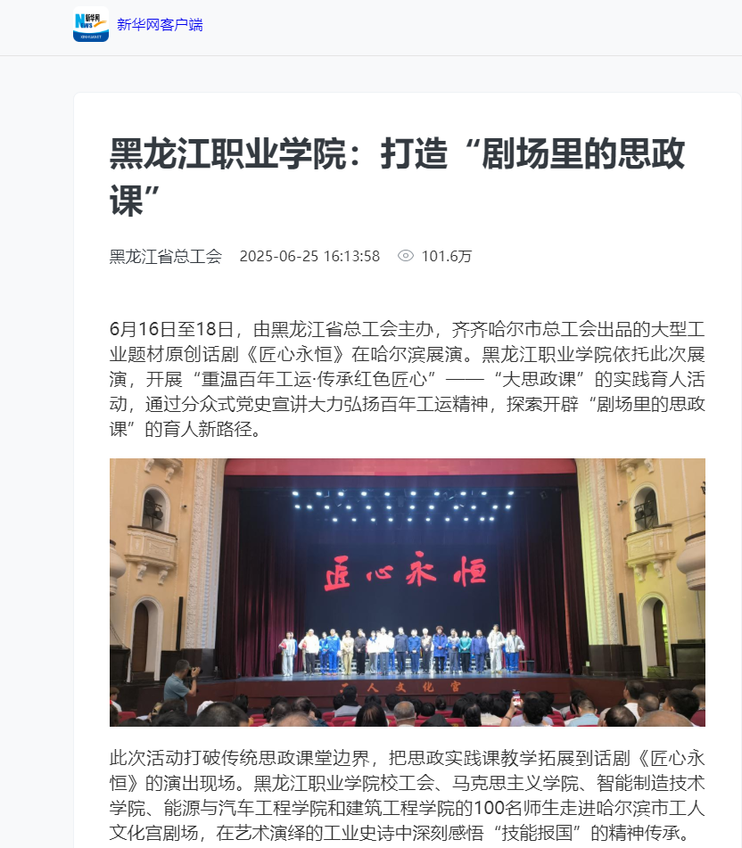 下一篇:【黑龙江工会】黑龙江职业学院:打造“剧场里的思政课” 培育新时代产业工人