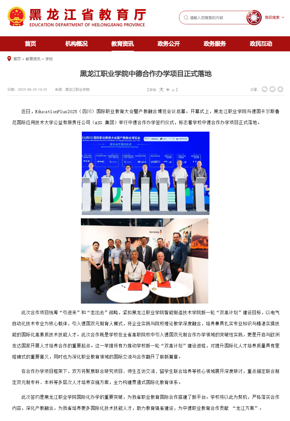 【黑龙江省教育厅】黑龙江职业学院中德合作办学项目正式落地