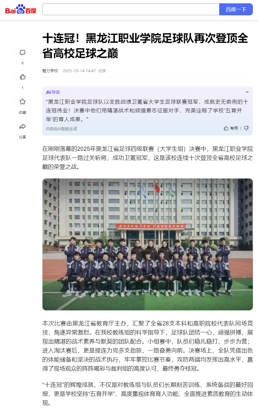 下一篇:【一点资讯】十连冠!黑龙江职业学院足球队再次登顶全省高校足球之巅