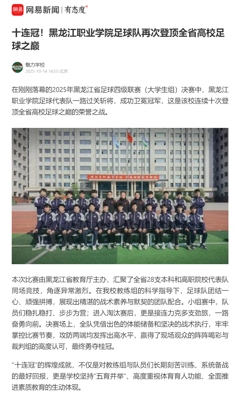 上一篇:【新浪新闻】十连冠!黑龙江职业学院足球队再次登顶全省高校足球之巅